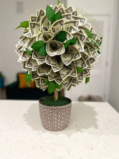 Here at KrystalNicholl customs I pride myself on quality. Apart of that quality is when creating a money bouquets we DO NOT burn,cut,mark, punch holes,glue, or use harsh tape on bills rendering the US currency unusable. I use new notes obtained from the bank, safe craft grade frosted tape and a special technique so that after the money bouquet is taken apart the money is still in excellent, spendable condition and can be deposited into your bank account or spent on that item you always wanted.